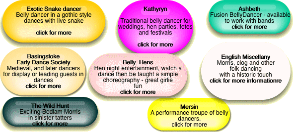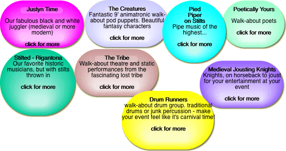 CATSPAW ENTERTAINERS Our entertainers vary greatly in what they can offer you. From mythological or folk tales, performance archeology, through dramatic juggling and magic, walkabout poets, giant stilt walkers (with music!) or a variety of styles of dance. Browse this section to see what catches your fancy. Email jo at The Catspaw for further information or bookings. | ||